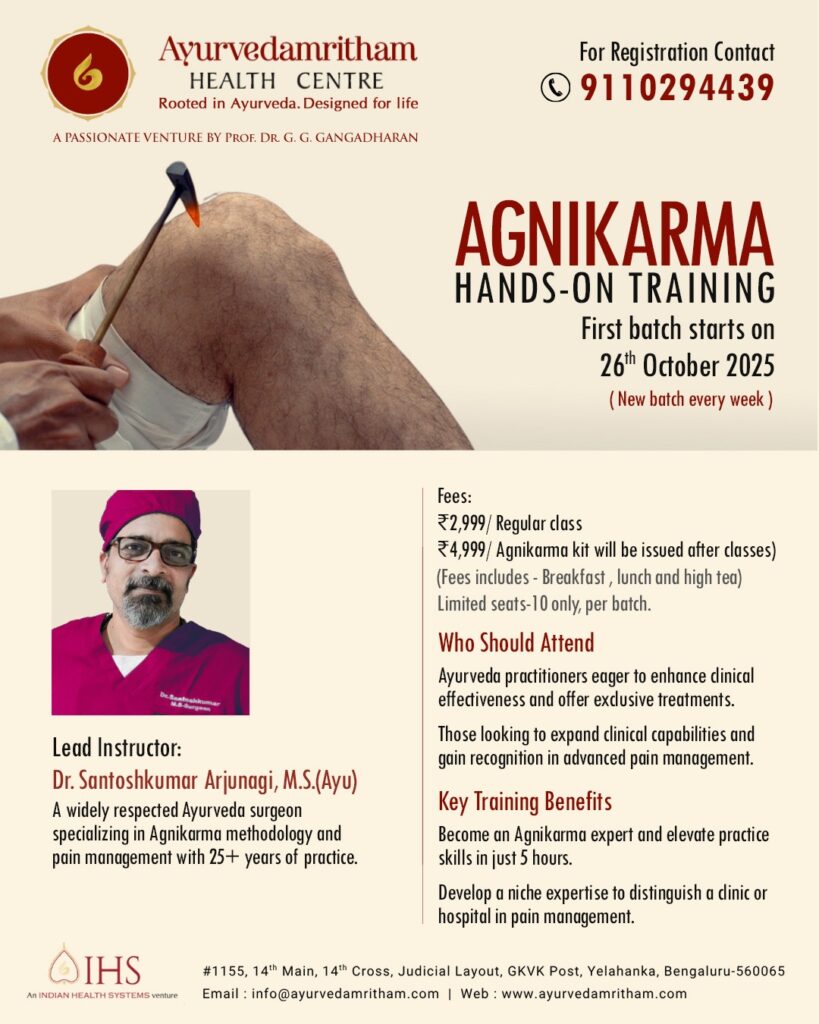 The Ayurvedamritham Health Centre, a passionate venture by Prof. Dr. G. G. Gangadharan, invites Ayurveda practitioners to an exclusive Agnikarma Hands-On Training Program starting 26th October 2025.