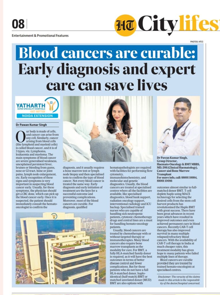 According to Dr. Pawan Kumar Singh from Yatharth Hospital, Noida Extension, many forms of blood cancer are treatable and curable when diagnosed early.